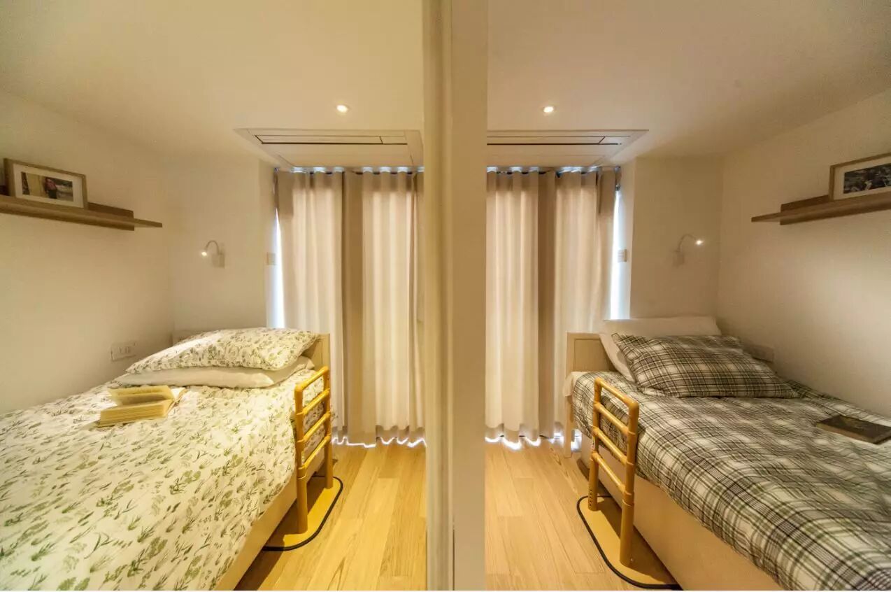 卧室顶部的完成面只有1米95的高度,设计师选择了大金单向气流嵌入式空调,送回风一体式,配合隔层的橱柜设计有效地解决了无法做吊顶这一课题。下出风方式,即使在上海湿冷的冬天,也可以有优质的制热效果。