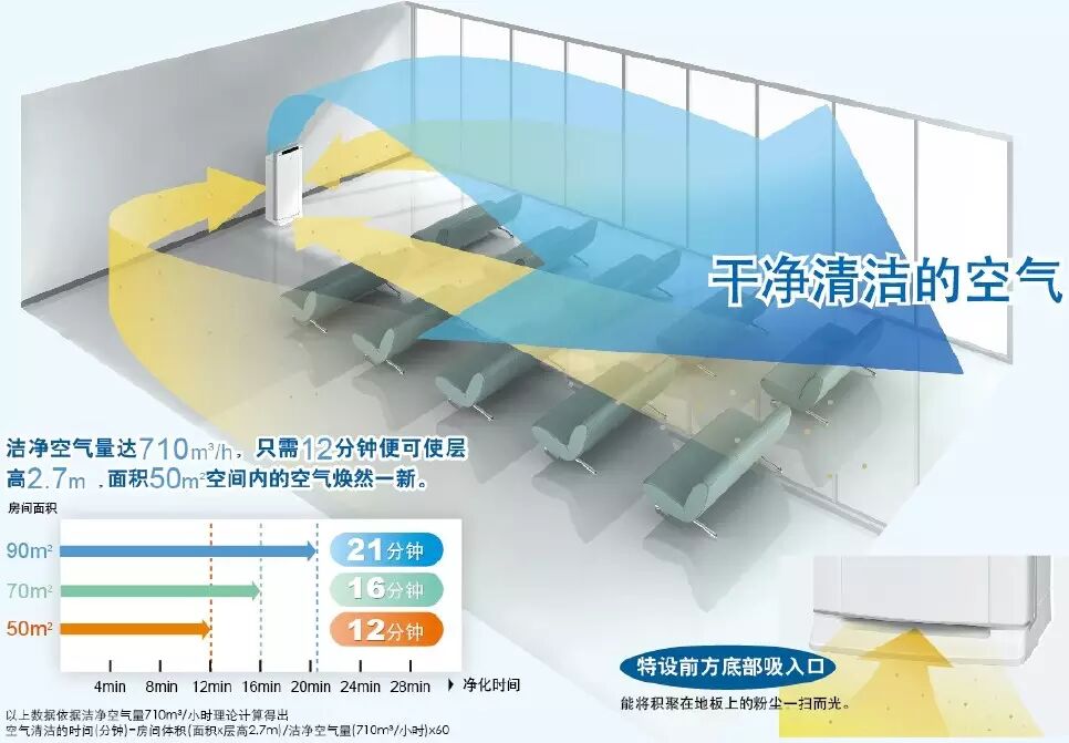 大金空气清洁器(商用型)采用双重滤网和双重风扇的构造,实现720m³/h的超大风量,洁净空气量高达710m³/h,并从3个方向强力吸入污浊空气,净化速度及效果得到大幅提升。
