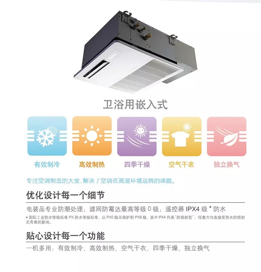 1、大金卫浴专用空调采用双热交的方式,出风温度比常见家用空调高5℃以上。风量甚至可达常见浴室用暖风机的1倍。
